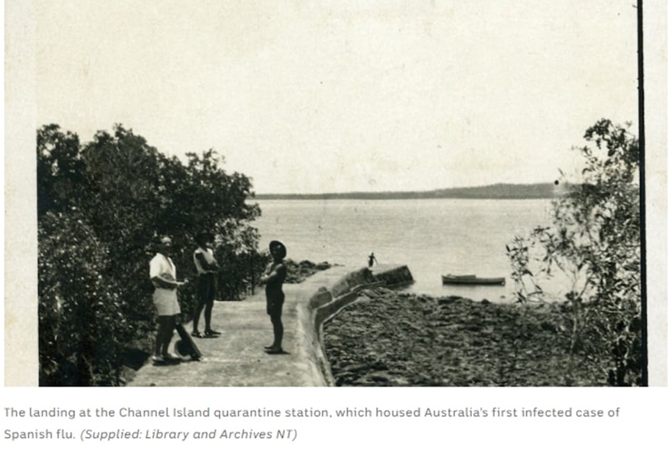 Did you know, the first case of the Spanish flu pandemic of 1918 arrived in Australia in Darwin? Due to quarantine policies, the case was isolated at Channel Island and the flu never spread to the community. It was not until 1919 when a ship from interstate brought the virus to NT soils that Spanish flu spread across the Territory (interstate vessels not required to quarantine).¹