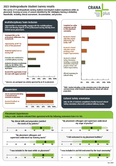 The survey results and direct feedback from CRANAplus Undergraduate Student Members are actively informing and shaping CRANAplus activities, including CRANAplus Position Statements developments and updates, and advocacy for health professional students. CRANAplus is committed to working with our student Members to further explore and clarify their experiences on placements in rural and remote areas.