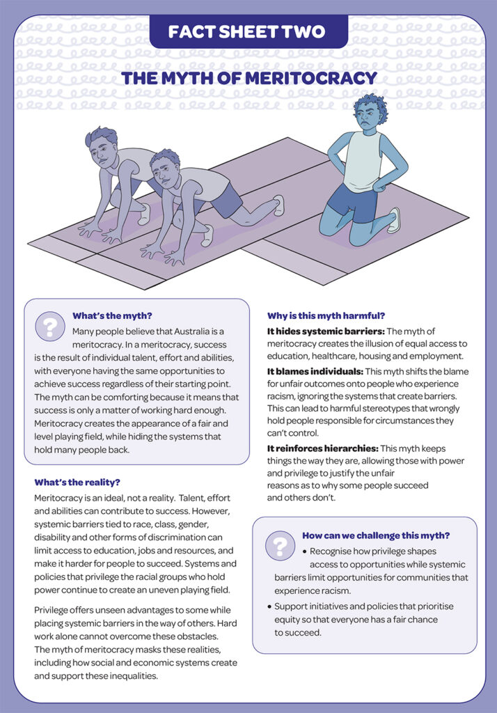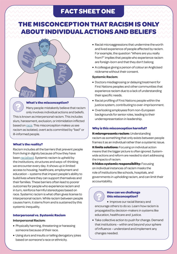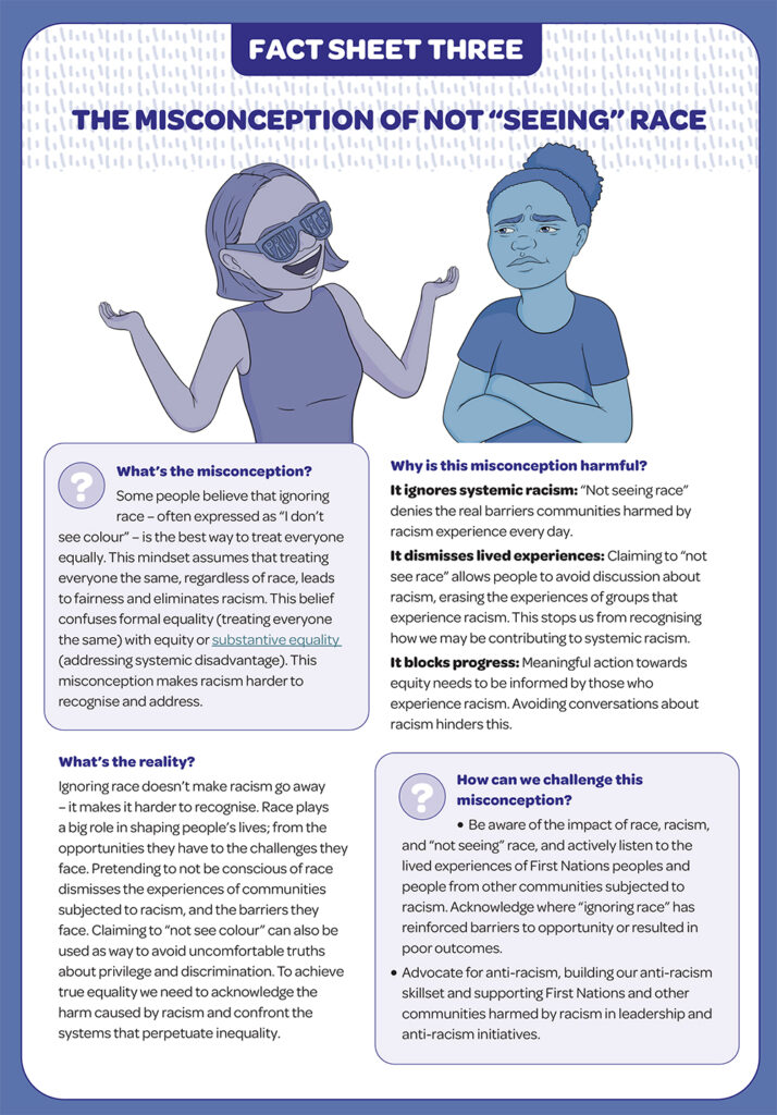 These fact sheets build on earlier self-reflection and education guides by unpacking how these myths arise, why they persist, and the ways they influence daily life, offering concise, accessible explanations and practical steps we can take to challenge racism and drive change.